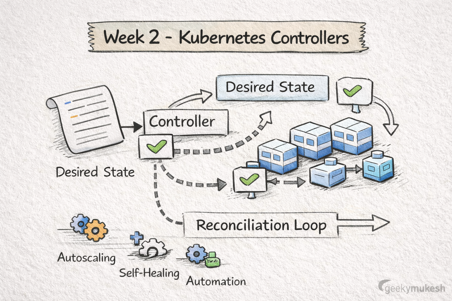 First, everything in Kubernetes starts with objects. In fact, these objects are the basic building blocks that run, expose, and configure your applications. For example, a Pod represents one or more containers running together, while a Deployment ensures that the correct number of Pods are always running. Additionally, Services provide stable networking endpoints, and ConfigMaps and Secrets allow you to externalize configuration and sensitive data. Therefore, mastering these objects in Week 1 lays the foundation for all subsequent Kubernetes learning. Next, you will explore how controllers maintain the desired state automatically.